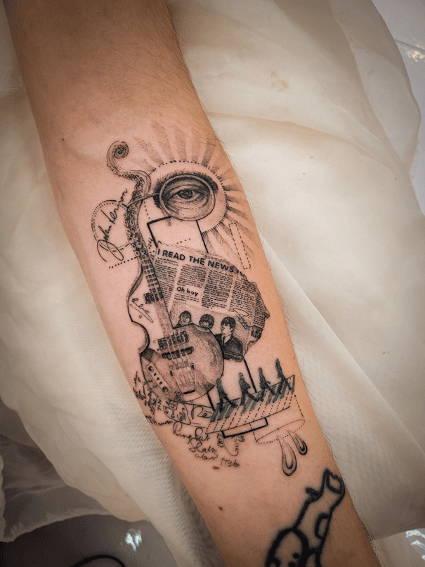 Graphic design has definetly influenced my tattoo style. All my pieces are very standalone. I don't do full sleeves because everything I do is seen as a graphic or a sticker on somebody. My art is rather very open, airy and has a lot of different things going on in it. It’s a collage of some sorts. Most of the time people come to me with 5-10 ideas and I then jumble it into one piece.