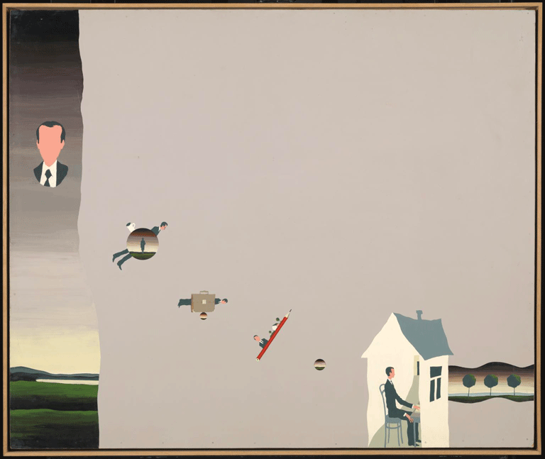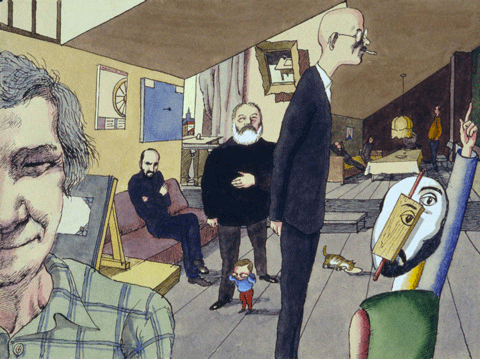 Tate Galleries notes that similar to the works of Ilya Kabakov, Pivovarov’s paintings from this era depicted a “world of communal apartments, tedious work and the frequent interference of the state-governed public sphere into the private world of the individual.” His work offered an introspective look at life in Soviet Russia and explored individual subjectivity, while living in a world that promoted the virtues of communism.
