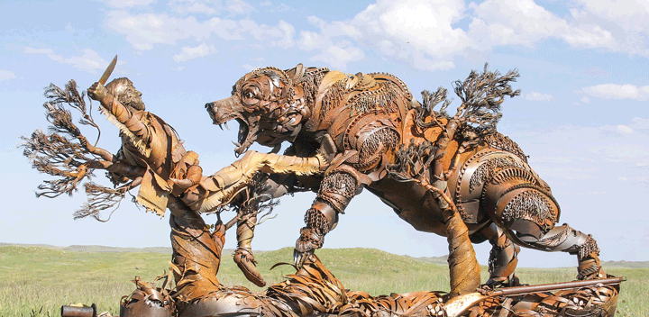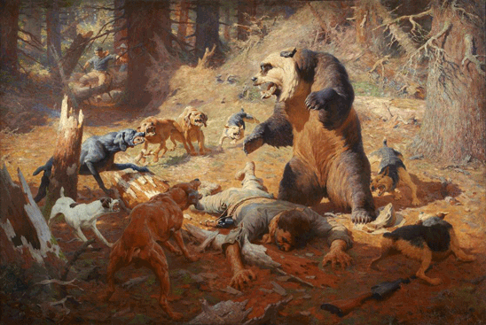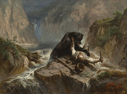 Glass’s encounter undoubtedly spawned a rise in 19th and early 20th-century paintings of bear attacks. Artists like William R. Leigh (1866-1955) and Arthur Fitzwilliam Tait (1819-1905) found relative success in portraying frontier life and the high drama of escape from a predatory bear. American artist Otto Sommer (1811-1911) portrayed a bear attack loosely inspired by the Hugh Glass story in Attacked by a Bear (1862) and American printing company Currier and Ives widely circulated the image of a Hugh Glass-like ordeal in The Life of a Hunter (1861). Today, Hugh Glass is still inspiring artists, with John Lopez’s 2015 multi-media life-sized sculpture, Hugh Glass Monument, Alejandro Iñarritu’s film The Revenant, and pop-surrealist painter Jota Leal’s work, The Hugh Glass Encounter.