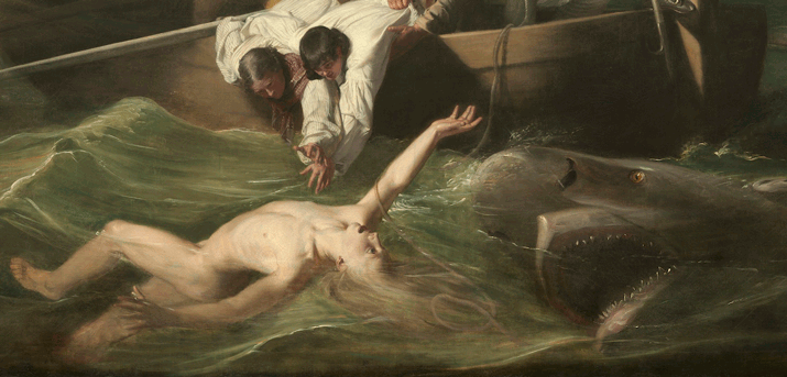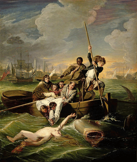 John Singleton Copley’s (1738-1815) painting, Watson and the Shark (1778), depicts the real-life event in which fourteen-year-old orphan Brook Watson (1735-1807) was ravaged by a shark while bathing in Havana Harbour. Watson, who had been working as a cabin boy aboard the Royal Consort, had decided to clean himself in the water just off the skiff of the ship while docked at port in Cuba. The seemingly calm waters, however, were in fact a breeding ground of activity due to the large amounts of food bits that would accumulate where large ships were loading and unloading supplies and cargo. As Watson bathed, he was unexpectedly pulled under by a large shark who rose up from underneath him to take an exploratory bite out of his right leg. The shark retreated for only a few seconds before circling back to take more from the already bloodied Watson, dragging him under again, and this time severing his right foot above the ankle. As Watson surfaced, his shipmates had crowded onto the skiff and were reaching out to him. When the shark propelled towards Watson a third time, one of the ship’s crew managed to fend it off with a boat hook while the others pulled Watson back aboard.