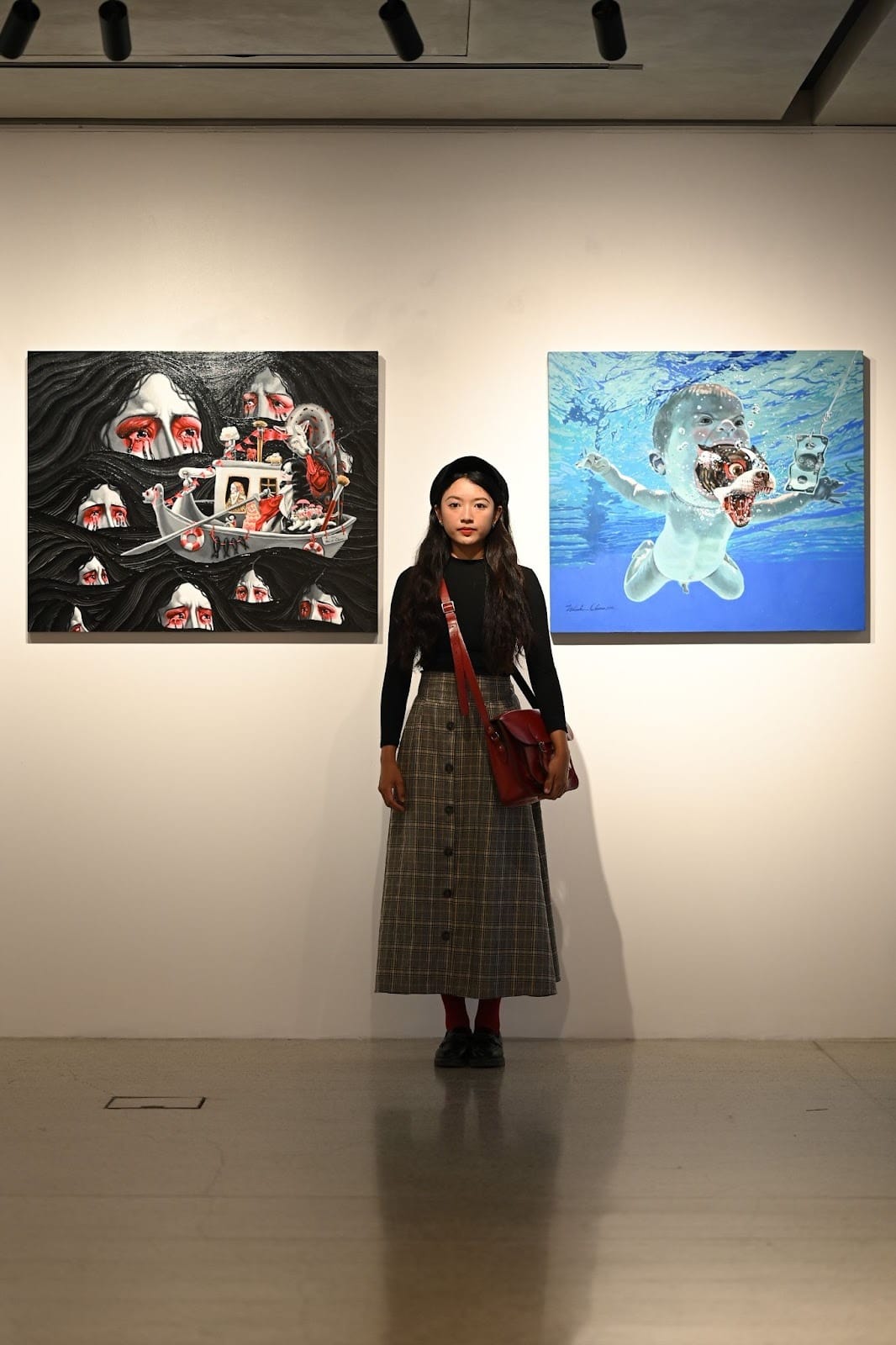 Take, for example, the two works that she presented in the group show Fractured Realities, hosted at Central: The Original Store. There, Chaima dissects the darker corners of the modern psyche, exploring the disconcerting truths of human behaviour that polite society prefers to ignore in two very different ways. Her first work touts darker colours, animals and little girls are seen rowing a boat in a sea made by the tears of women. This work is more immediately an attack on the senses, where the dark undertones of a young woman’s life are laid bare. Meanwhile, her second work sees her recreating Nirvana’s iconic Nevermind album cover that presents a baby swimming after cash. Chaima has added her own touch to the album cover’s anti-capitalism message by including a dog that’s sprung out of the baby’s mouth.