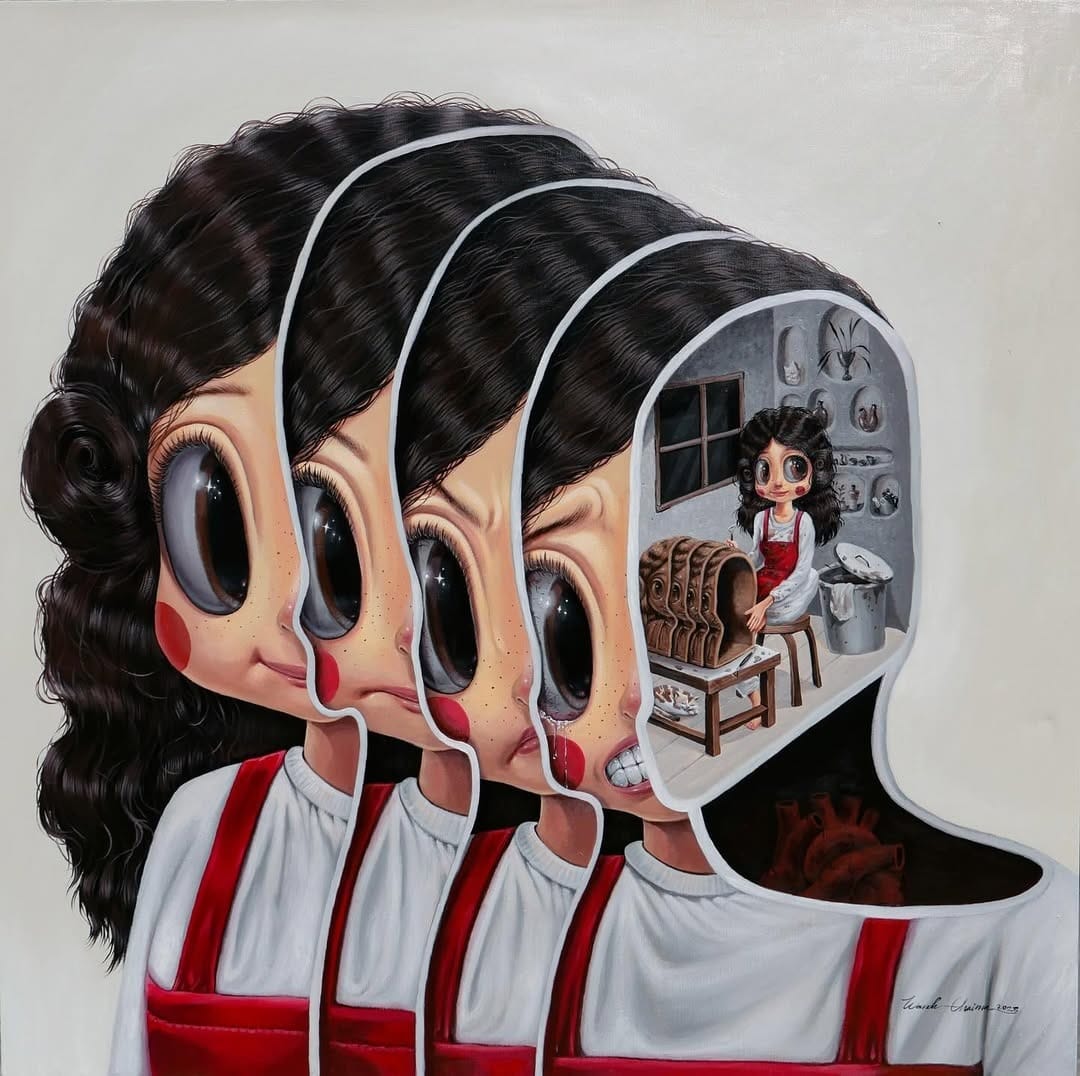 As seen in her work Yummy and more, the core tension in Chaima’s work also lies between the internal emotional state and the external mask. Her characters often sport expressions that are slightly too wide, smiles that are strained, or eyes that betray a deep sense of emptiness. These are visual metaphors for the masks we wear to survive in a high-pressure society. In a world that demands constant productivity and curated happiness—especially on social media—Chaima highlights the psychological cost of maintaining composure. Her "fractured realities" are the cracks in the facade, the moments where the unhealed traumas of living leak through the performance of being okay.