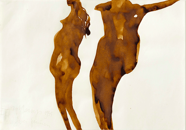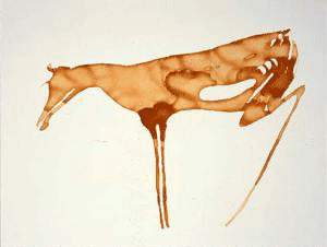 The absence of humans in cave paintings has been an alluring enigma since its discovery. Humans, if painted at all, are depicted without detail as stick-like figures, inferior beside the large and powerful presence of the comparatively detailed paintings of animals. Paleo Archaeologist Jean Clottes concludes: “The essential role played by animals evidently explains the small number of representations of human beings. In the Paleolithic world, humans were not at the center of the stage.” It is only when the creation of cave paintings came to an end approximately 12,000 years ago with the development of early civilizations in the Neolithic Revolution that human faces began to make an appearance in art. Joseph Beuys’ early watercolours shed the human-focused perspective that so much of contemporary art falls prey to and returns the human form to ancient times. With a sensitive eye to form and structure, Beuys paints orange-toned animals reminiscent of cave art along with people among these works of animals with no discernible difference in his depiction. Beuys’ watercolours serve as a humbling reminder of the exaggerated sense of human importance in comparing people to animals with influence from cave art.