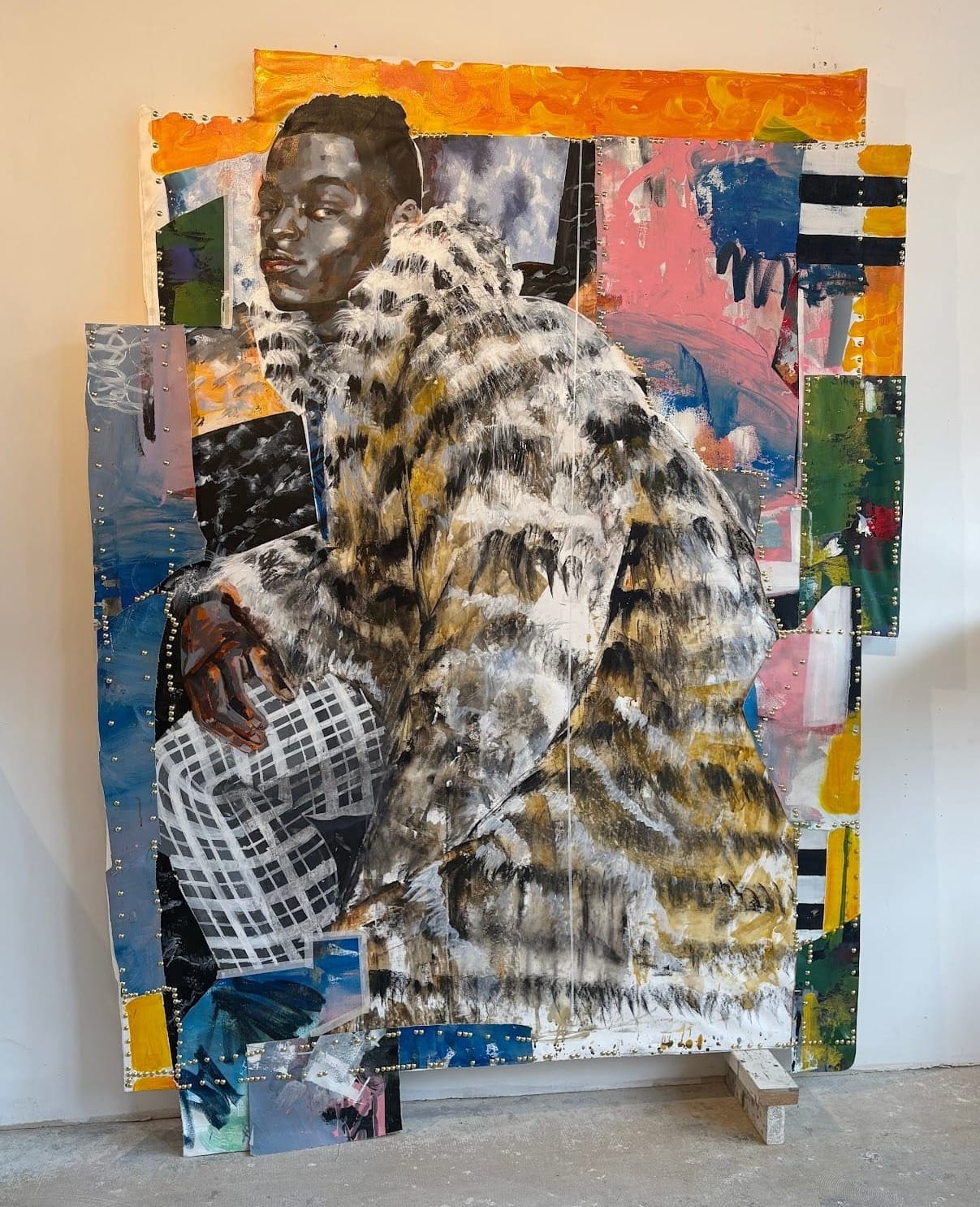 His paintings play with depth and form, appearing to borrow from cubism and neo-expressionism, though his style, as he would admit, is evolving constantly. The pieces that hold the most visual weight in his gallery are full-body portraits, like acrylic Standing tall, a painting that does just that, at over seven feet tall. The painting depicts a Black man crouched on a kneeling knee, clad in a striped fur coat and patterned pants. While his clothes and skin are subdued in colour, the rest of the work pieces together swishes and blocks of colour, adding a new meaning to the layering process of painting. The painting extends beyond the boundaries of even a conventional large frame, darting out in several spots that appear to be additions to the canvas. It leaves the viewer with the impression that his subject is larger than life.